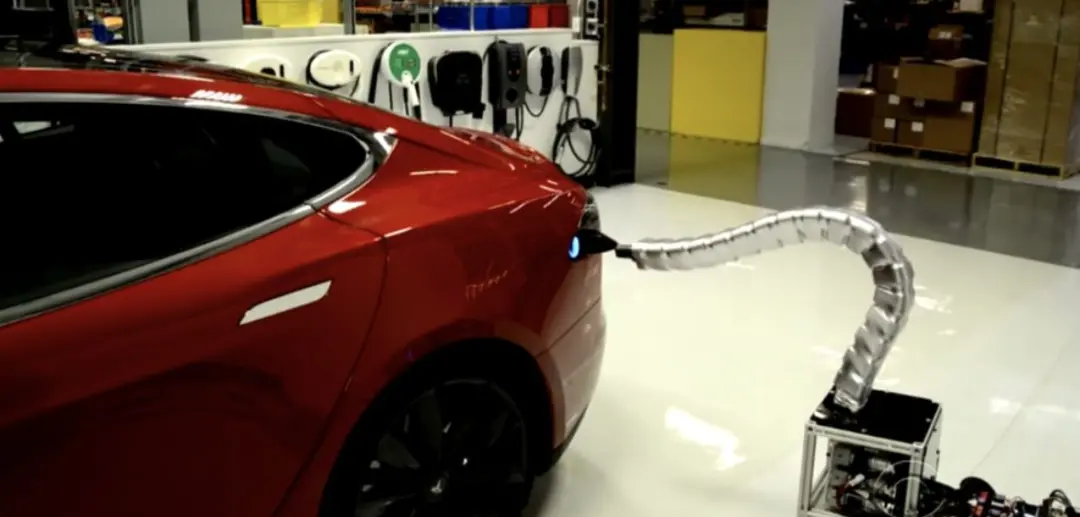 之前特斯拉的設(shè)想方案是“蛇臂充電”,像蛇形一樣的充電器可以感應(yīng)到汽車充電口,然后自動插入充電。