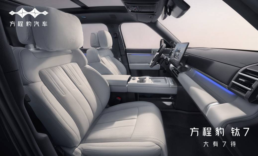 座椅方面,方程豹鈦7全車采用真皮座椅,并升級加配了云感頭枕,副駕舒享座椅配置,超大腿托 + 更大開合角度,符合人體工學設計,舒適度拉滿??臻g方面,得益于方程豹鈦7的4999mm的車長,乘員艙有效車長 3310mm,得房率高達 70.9%,二排放倒后最大容積可達 1880L,充分滿足家庭出行的儲物需求。
