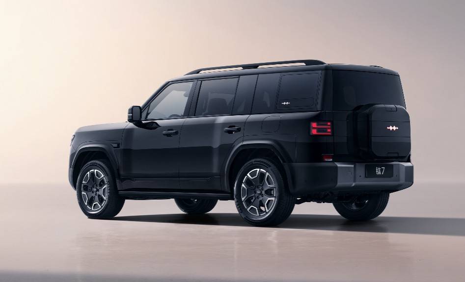 側面來看,新車側面采用較為平直的設計,筆直的腰線從車頭貫穿至車尾,配合寬大的輪眉,野性十足。在車身尺寸方面,鈦7車長4999mm,寬1995mm,高1865mm,軸距為2920mm。從尺寸來看,新車大于豹5,等同于豹8,遠超同級SUV。車尾部分,新車尾燈組造型與前大燈組相呼應,方盒子越野車標志性的“小書包”也沒有缺席。