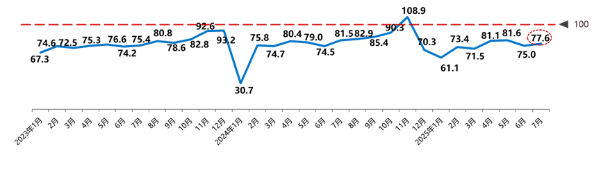 數(shù)據(jù)顯示:7月汽車消費(fèi)指數(shù)為77.6,較上月上升,預(yù)計(jì)8月份市場(chǎng)較7月有所回升;7月入店分指數(shù)為72.6,較上月略有上升。