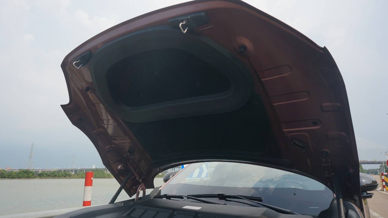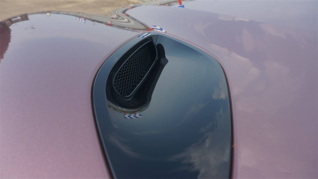 整個頭燈被分為上下兩部分,下半部分才是真正的前照燈組,而上半部分則是LED日行燈,采用了完全鏤空的造型,立體感一下強化了很多。而前機蓋上還帶有一對朝向后方的通風(fēng)道,結(jié)合對前機艙的觀察,氣流可能是從燈組上沿流入,在前機蓋下方流通后,從機蓋頂部流出。有興趣、有條件的朋友們可以研究下。