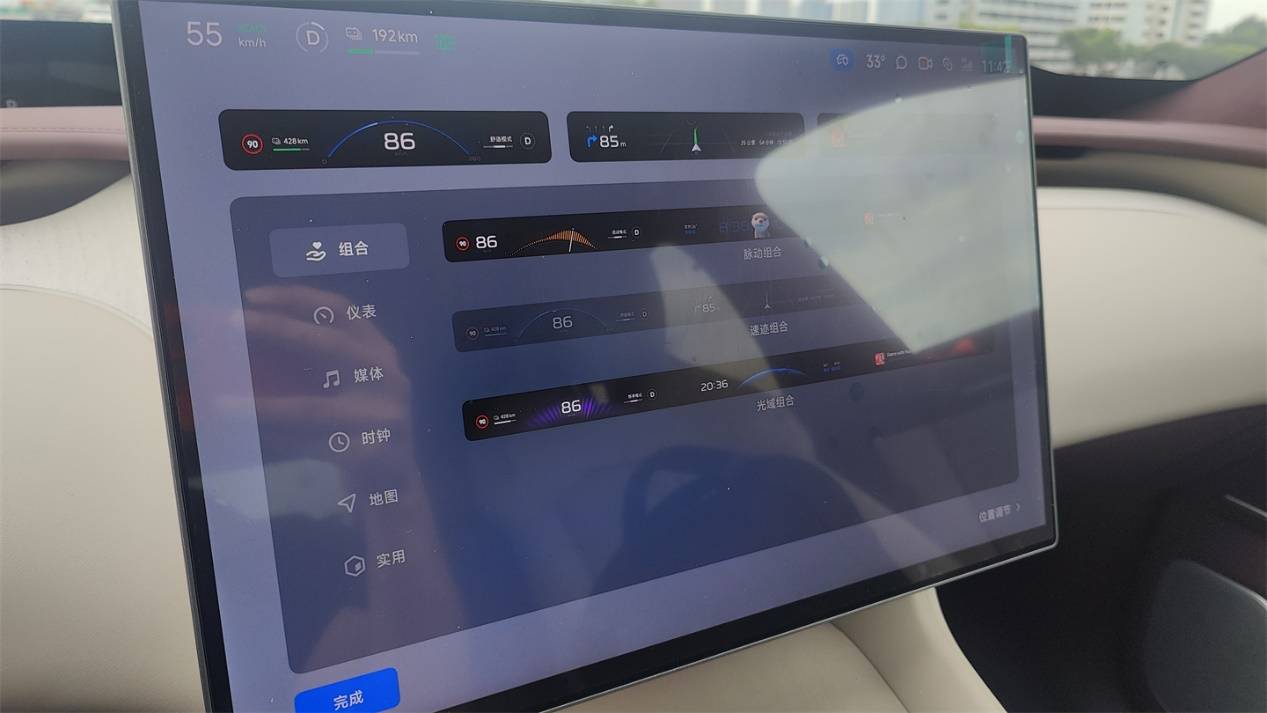 更重要的是,它的成像范圍比AR-HUD更寬,幾乎和阿維塔慣用的遠端屏一樣、顯示內(nèi)容非常豐富,同時成本又更低。可以看到,P-HUD可顯示的內(nèi)容并不少,包括了儀表數(shù)據(jù)、多媒體、地圖和導(dǎo)航等等,系統(tǒng)對于其排布位置、樣式給出了很多自定義選項,可玩性很高。
