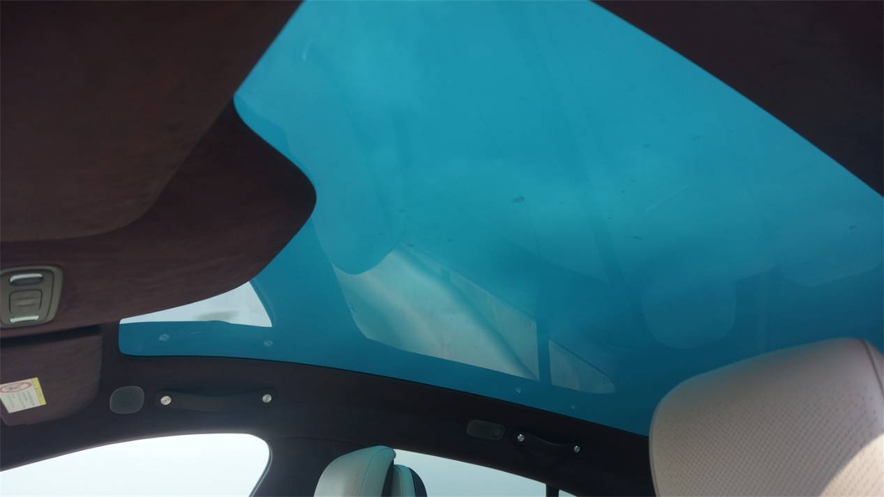 沒有遮陽簾的YU7,在頂配上增加了可變色的全景天幕。然而和極氪001一樣,透光狀態(tài)下天幕看起來泛著偏綠的藍色,觀感稍顯一般。遮光效果下的灰黑色效果會更好一些。從透明狀態(tài)到遮光狀態(tài)大約需要幾分鐘的時間,變色的過程如同水墨畫染色一般,看起來感覺有點奇怪。
