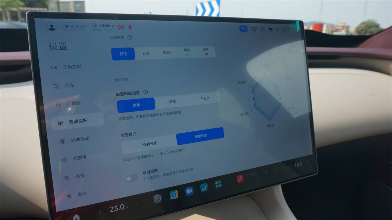 動能回收默認只提供了兩個檔位、以及一個自定義檔位,差異性會有點大,個人推薦柔和狀態(tài),能夠提供接近于燃油車丟開油門之后非常微弱的減速感,開起來更舒服自然;標(biāo)準(zhǔn)模式下雖然接入的頓挫感有所減弱,但是減速度比較大,有很明顯的拉扯感,平時用容易暈車。