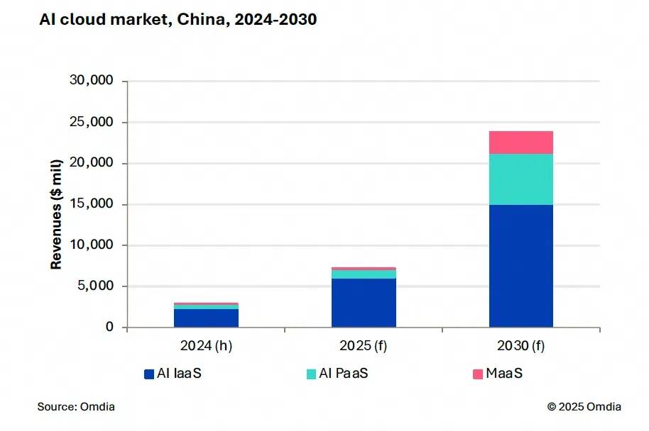 對于這個“未來十年技術領域最大的行業機會”,受益的不止是阿里云一家廠商。Omdia預測,2025年到2030年,中國AI云市場復合年增長率(CAGR)將達到26.8%,2030年市場規模將攀升至1930億元。技術層面上,未來AI云的增長將由多Agents合作、上下文工程、AI安全、大規模API調用等驅動,MaaS層預計增長最快,復合年增長率將超72%,2030年將達177億元規模。