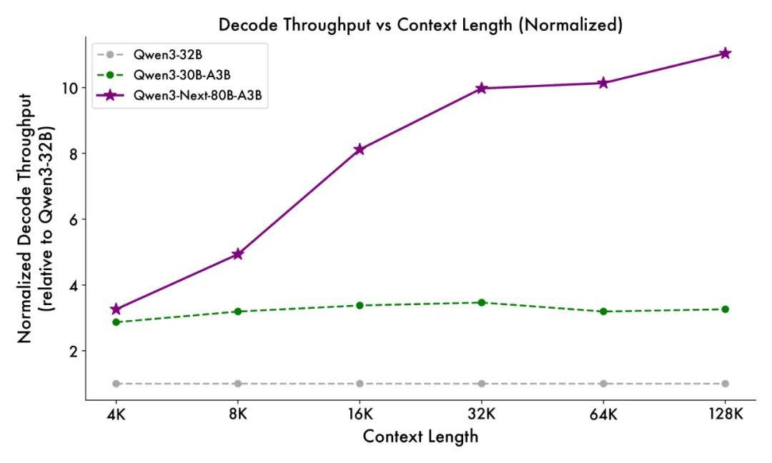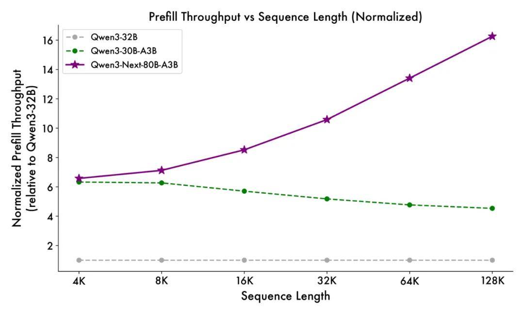得益于創(chuàng)新的混合模型架構(gòu),Qwen3-Next 在推理效率方面表現(xiàn)出顯著優(yōu)勢(shì)。與 Qwen3-32B 相比,Qwen3-Next-80B-A3B 在預(yù)填充(prefill)階段展現(xiàn)出卓越的吞吐能力:在 4k tokens 的上下文長(zhǎng)度下,吞吐量接近前者的七倍;當(dāng)上下文長(zhǎng)度超過(guò) 32k 時(shí),吞吐提升更是達(dá)到十倍以上。
