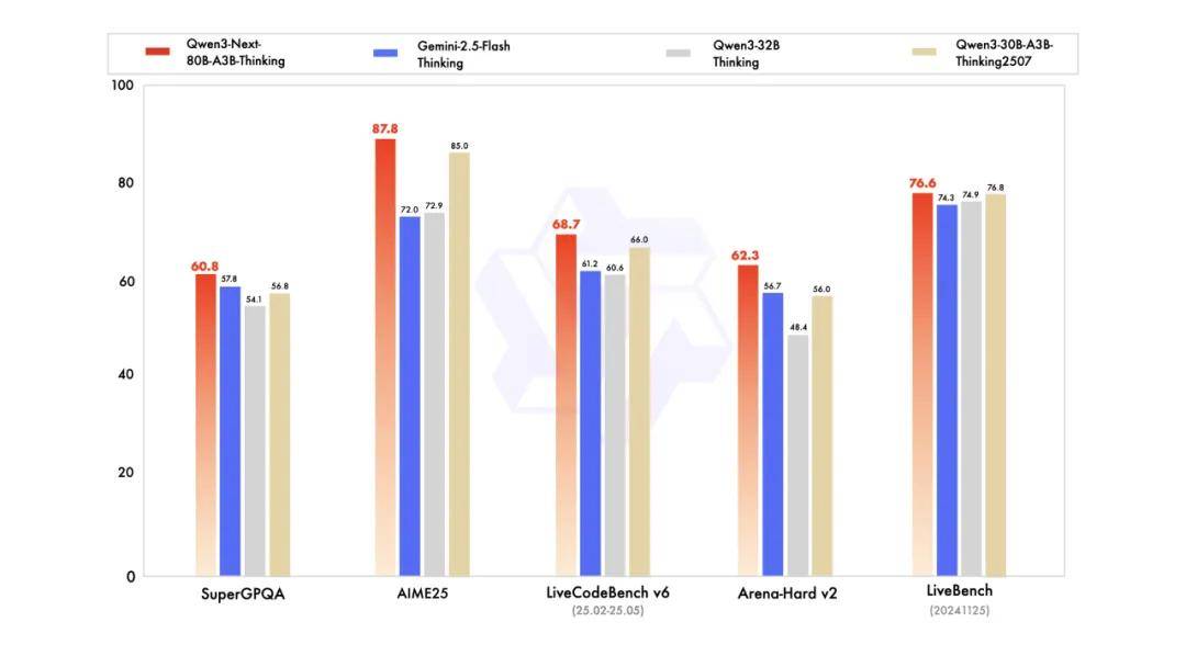 在編程(LiveCodeBench v6)、人類偏好對(duì)齊 (Arena-Hard v2) 以及綜合性能力 (LiveBench) 評(píng)測(cè)中,Qwen3-Next-Instruct 表現(xiàn)甚至超過(guò)了千問(wèn)的開(kāi)源旗艦?zāi)P停⒃诎ㄓ弥R(shí)(SuperGPQA)、數(shù)學(xué)推理(AIME25)等核心測(cè)評(píng)中全面超越了 SOTA 密集模型 Qwen3-32B;Qwen3-Next-Thinking 則全面超越了 Gemini2.5-Flash-Thinking,在數(shù)學(xué)推理 AIME25 評(píng)測(cè)中獲得了 87.8 分。而達(dá)到如此高水平的模型性能,僅需激活 Qwen3-Next 總參數(shù) 80B 中的 3B。