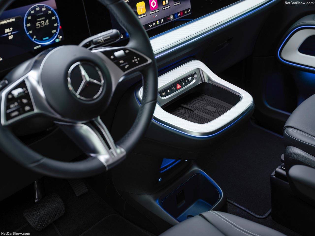 內飾延續奔馳新能源產品設計趨勢,顯得足夠開闊,豐富的氛圍燈效果也提升了層次感。在10.25英寸儀表屏、14英寸中控屏之外,可選裝14英寸副駕屏和23.1英寸HUD,在第四代MBUX上融合多款AI大模型,只是屏幕黑邊有些明顯。