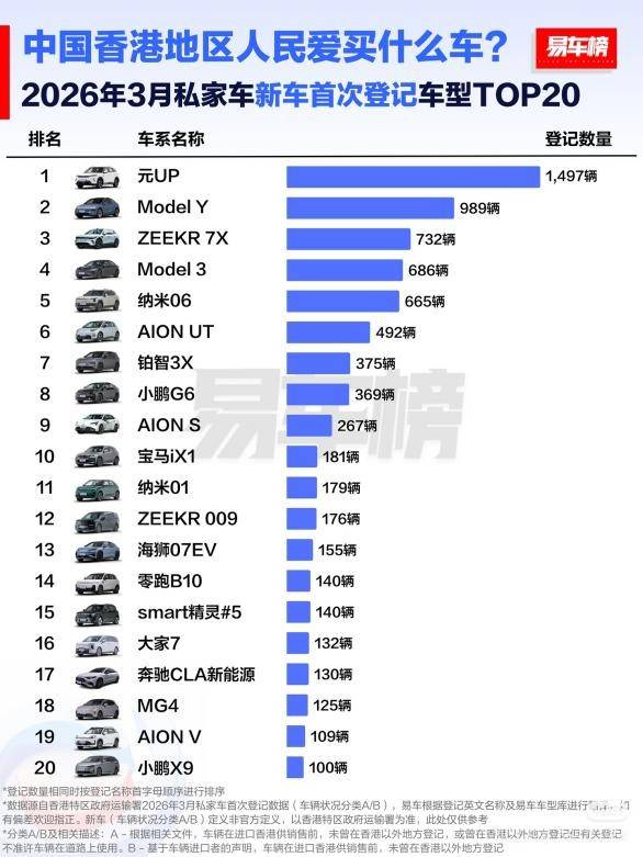 2026年伊始,比亞迪在香港市場捷報頻傳。易車榜數據顯示,3月,比亞迪以1763輛的成績登頂香港汽車市場全品牌銷量榜首,其中元UP單車貢獻1497輛,成為當月最暢銷車型。