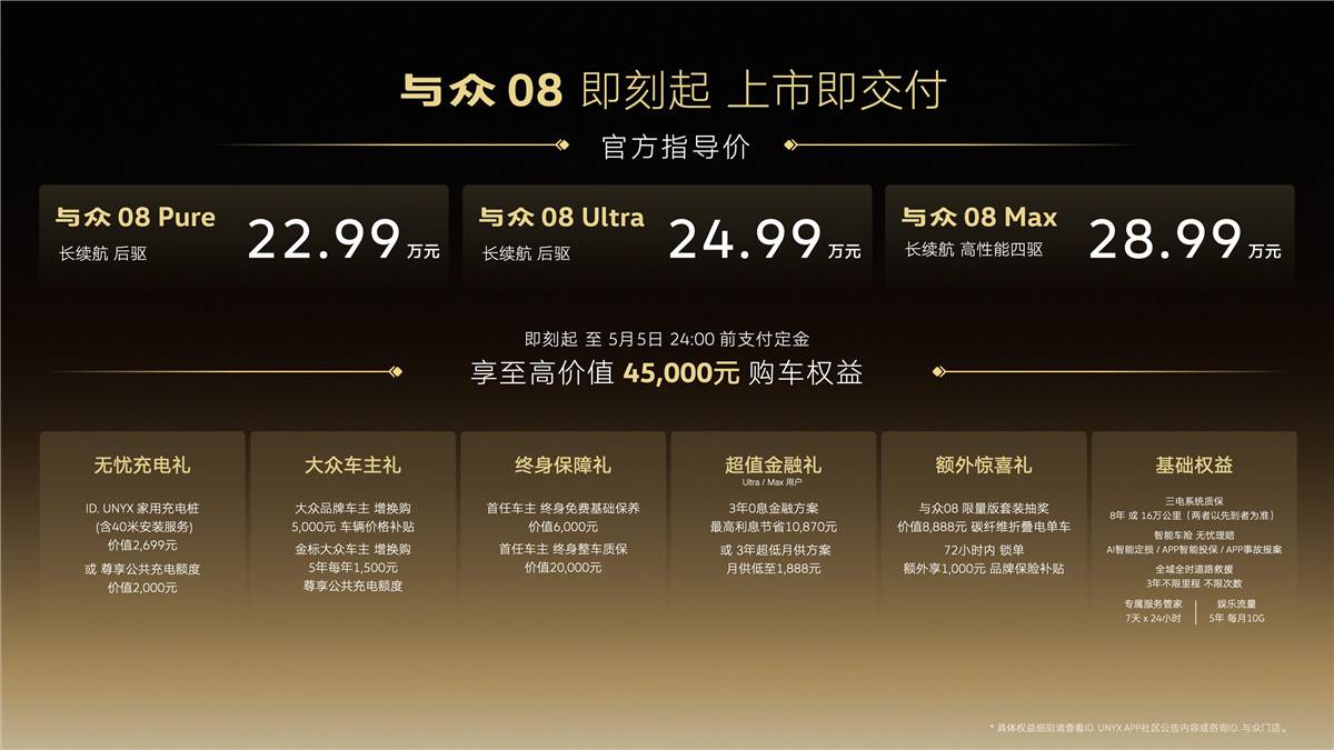 2026年4月16日,金標(biāo)大眾旗下首款全時(shí)互聯(lián)全尺寸純電SUV——與眾08在深圳正式上市,新車推出Pure、Ultra、Max三款車型,官方指導(dǎo)價(jià)22.99萬- 28.99萬元,并提供限時(shí)購車權(quán)益。作為大眾在華電動(dòng)化轉(zhuǎn)型的關(guān)鍵車型,它既保留了德系車一貫的安全與操控,又在智能化、設(shè)計(jì)、空間和補(bǔ)能上貼合中國(guó)家庭需求,不再是簡(jiǎn)單的“全球車改款”,而是真正面向國(guó)內(nèi)用戶打造的純電旗艦。本文從設(shè)計(jì)、空間、智能、駕控、安全、服務(wù)等維度,用平實(shí)視角全面解讀這款新車。