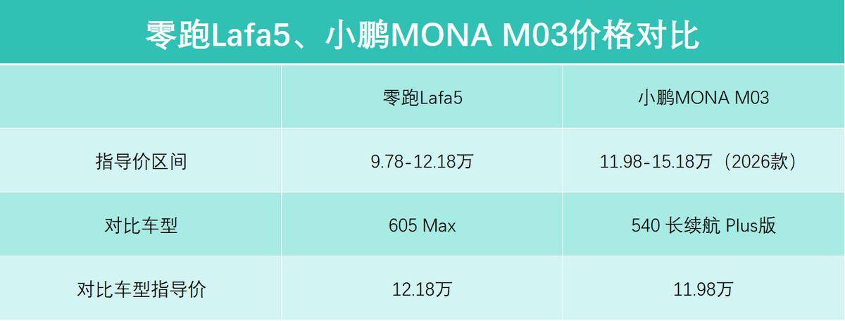 價格層面,零跑Lafa5的指導價區間是9.78-12.18萬,本月零跑Lafa5 Ultra也即將上市,新車還將搭載運動套件,動力也會進一步提升。小鵬MONA M03近期也推出了2026款車型,指導價區間是11.98-15.18萬。從價格上能看到,零跑Lafa5頂配版車型(605 Max)與小鵬MONA M03入門版車型(540 長續航 Plus版)非常接近,二者都是12萬上下,咱們就以這兩款車型為例,展開對比。