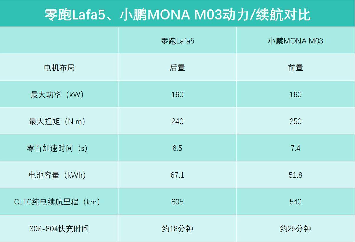 對于純電動車而言,續航和補能效率也至關重要,畢竟這也影響到用戶的出行半徑,包括動力,其實也會影響到大家的駕駛體驗,咱們挨個來聊。首先說動力,零跑Lafa5搭載一臺后置驅動電機,小鵬MONA M03搭載的是前置電機,巧合的是,二者的電動機最大功率均為160kW。