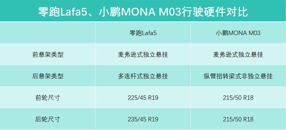 底盤部分,兩臺車也展現出了不同的調性。從基礎的結構來看,零跑Lafa5采用前麥弗遜-后多連桿的組合,四輪獨懸在同價位屬于是高規格的硬件。小鵬MONA M03就采用前麥弗遜-縱臂扭轉梁式非獨立懸架,屬于是同價位常見的組合。由于零跑Lafa5采用了后獨立懸架,理論上對于整體的操控性,以及后排的舒適性,會有更積極的作用。