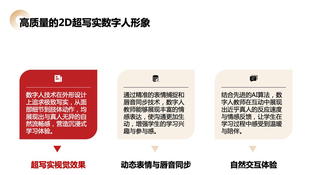 - 借助數字人技術,在線課堂不再局限于單向的知識輸入。數字人可以根據不同的課程需求擔任虛擬班主任、教師、助學指導員等多種角色,促進師生間的多元化交流。通過定制化的數字人形象和聲音,還能進一步增強教學的親和力與吸引力,提升線上學習的樂趣。