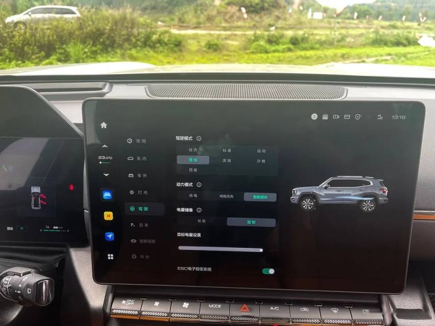 至于智能混動模式,主要是系統根據不同的場景而選擇是后驅還是四驅,以及是串聯還是并聯等。在試駕當天,我主要是用智能混動模式,尤其是面對越野非鋪裝路時,想看看它在iTVC智能扭矩矢量控制系統加持下的越野表現。