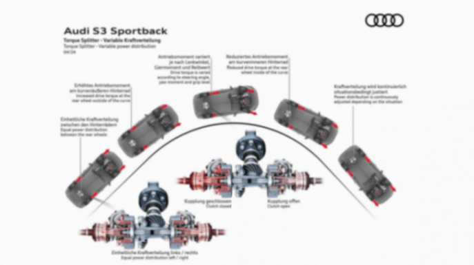 這個能獨立分配扭矩的后差速器,對于S3的意義還是很大的,這套復雜的差速器原理卻很好理解,就是在后差速器上,在左右兩邊獨立設置兩組多片離合器,實現為不同車輪的動力分配。在車輛轉彎時,為外側車輪提供更多的動力,減少內側車輪的動力輸出,更好地利用有附著力的車輪。整體的效果類似限滑差速器,但由于能更靈活地分配動力,有更好的動態效果。奧迪S3雖然直線很強,但因為偏前的四驅,依舊很容易有轉向不足的情況,有了這套系統,相信能擁有更靈活的尾部姿態,不再只是蹦直線的04車。